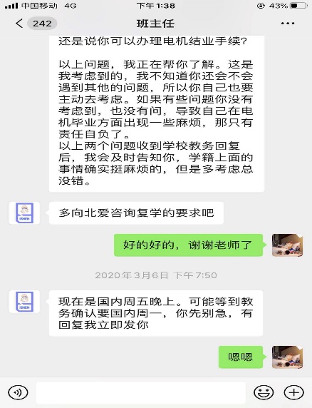关于回国的这个决定由于牵扯比较大,LETOU国际米兰官网的老师给予了我很多帮助,特别是我的班主任王禾曜老师,由于我身在外国不太方便,王老师帮助我了解了许多关于电机方面的信息,帮我分析了利害关系,并告诉我不管我做什么决定电机都支持,这些让我十分有安全感,这里也感谢LETOU国际米兰官网负责教务工作的熊鸿军老师给予了很多的指导。负责LETOU国际米兰官网出国留学工作的辅导员黄富长老师全程关心我的行踪并替我完成学校的回国申请流程,LETOU国际米兰官网副院长陈秀春老师和院长富立友老师为确保我回国之路顺畅,深夜临时紧密与国交处老师的联系。从我开始考虑回国开始,我就从电机的各位老师那里询问了解了许多信息,老师们也非常积极乐意地帮助我,并对我表示关心,甚至帮我考虑到了我自己没有考虑到的地方。最终回国前递交回国申请的时候老师也帮我仔细确认了信息的填写,帮助很大。真的十分感谢电机的各位老师。