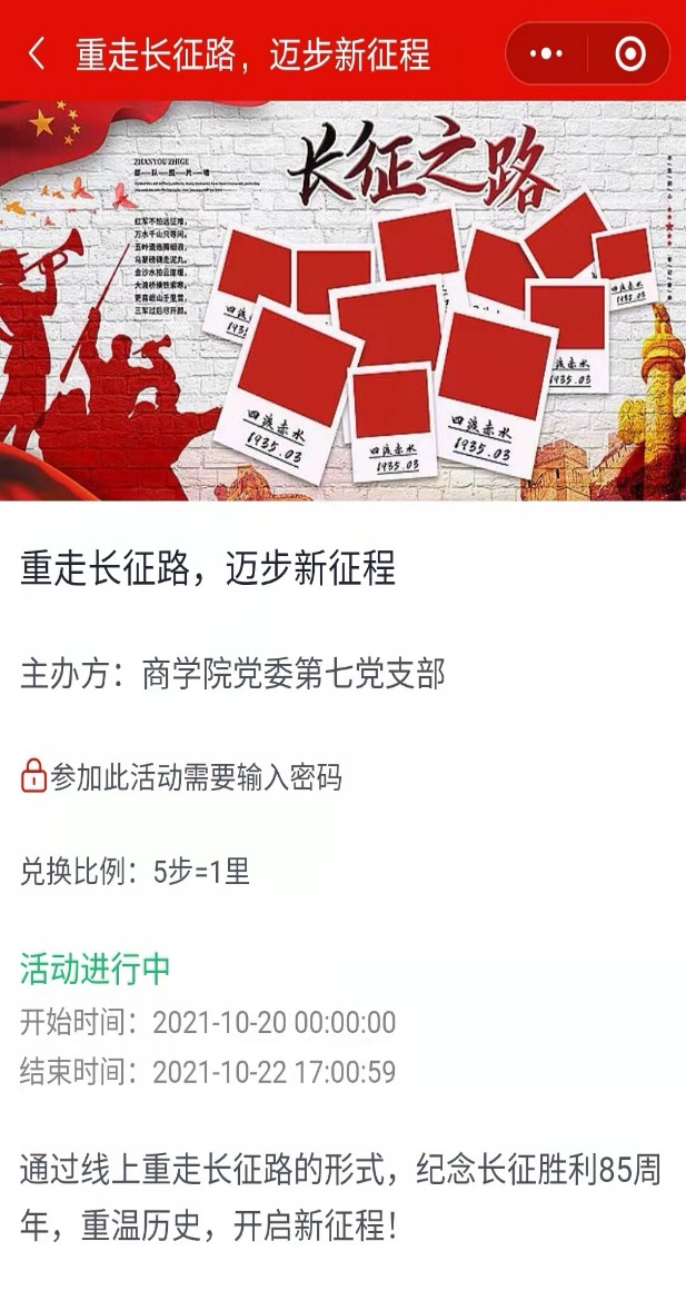 1020日开始,LETOU国际米兰官网党委第七党支部开展“重走长征路,迈步新征程”的线上长征活动,LETOU国际米兰官网师生党员、发展对象和入党积极分子通过将实际走路步数转化为线上长征里程的方式,体验线上重走长征路,线上打卡长征途径地点,并学习长征相关知识。