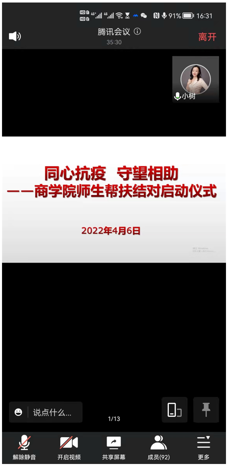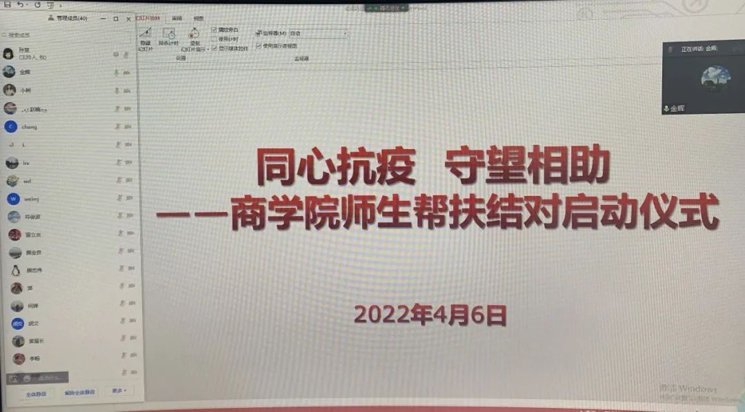 党委书记金辉介绍了此次师生帮扶结对工作的有关情况。他指出,当前,上海市和上海高校系统疫情防控工作面临前所未有的严峻形势,学院校内外师生都在各自的岗位上努力工作学习,同时积极为疫情防控做贡献,在此特殊的学校处于准封闭管理状态、学生原则上不离楼的情况下,我们的一些特殊学生群体在思想、学习、生活等方面面临一些问题和挑战,学院应提高站位,勇于担当,主动靠前,积极作为,组织学院党政干部、教师骨干等伸出援手,加强对这部分学生群体的关心关爱工作,通过师生互动的形式帮扶结对。金辉指出,通过师生互动,我们要加强对学生的关心关爱,关心了解学生的思想、学习、生活情况,提升学生抗击疫情的信心和必胜信念;同时,也希望通过长期的互动交流,不断提升学生的学业、综合素养等,促进学生的全面发展。
