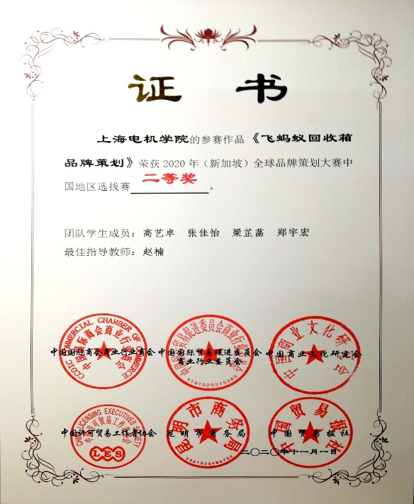 第九届全国大学生电子商务“创新、创意及创业”挑战赛上海赛区挑战赛二等奖 | 全球品牌策划大赛中国地区选拔赛二等奖 |